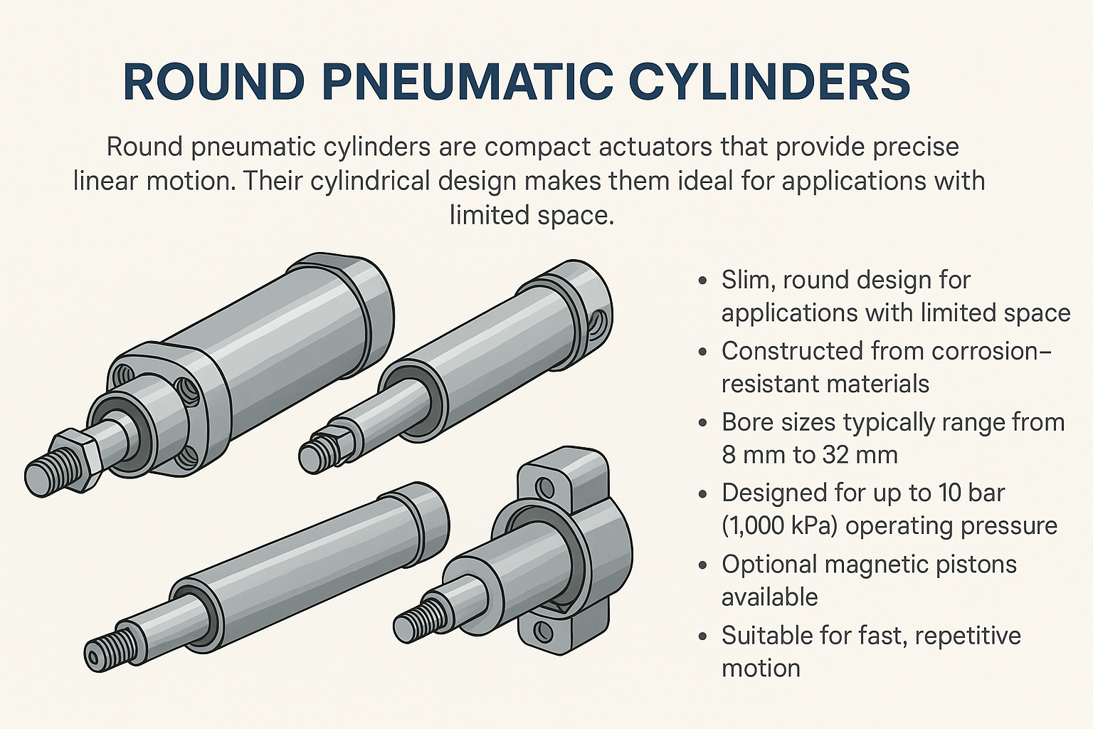 Pneumatic Round Cylinders offer benefits such as simplicity, cost-effectiveness, high speed, and suitability for various tasks in manufacturing and automation.